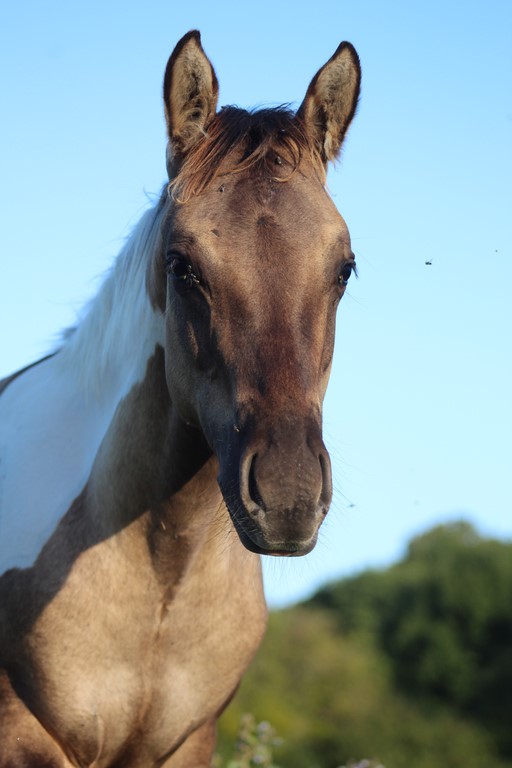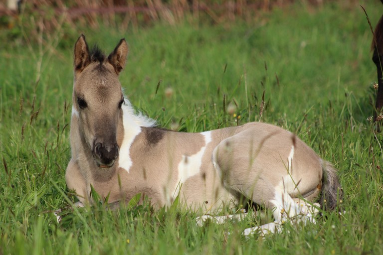 JESSE JAMES PRIMROSE est un beau et solide poulain paint horse grullo tobiano avec un très beau marquage dun, une jolie tête. Un poulain très craquant!
