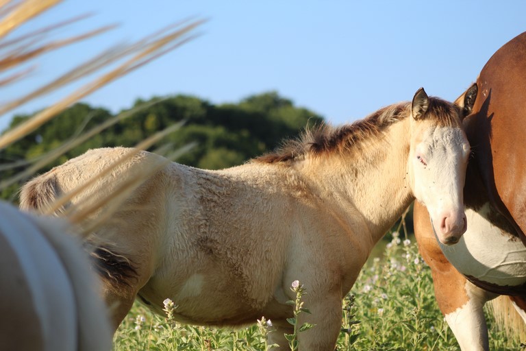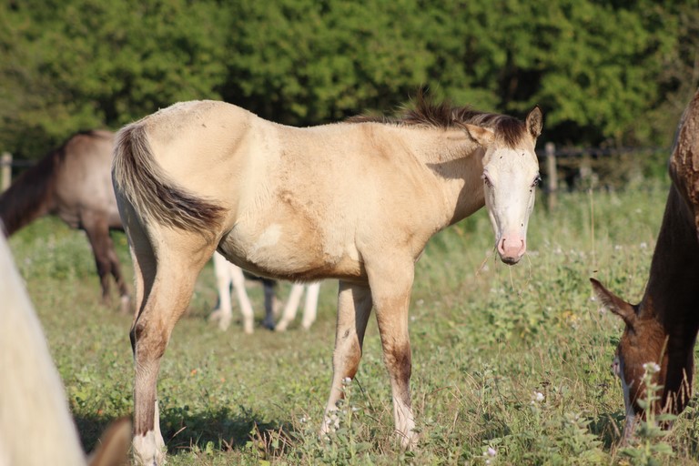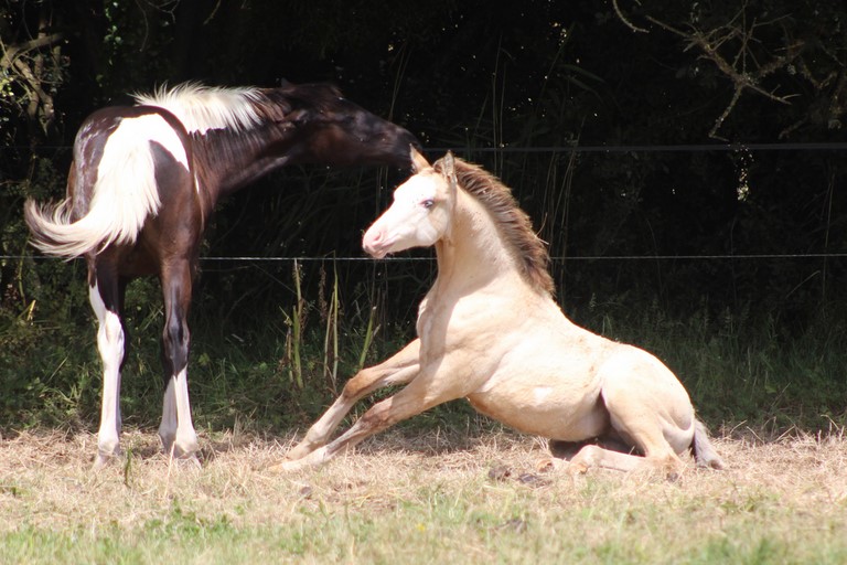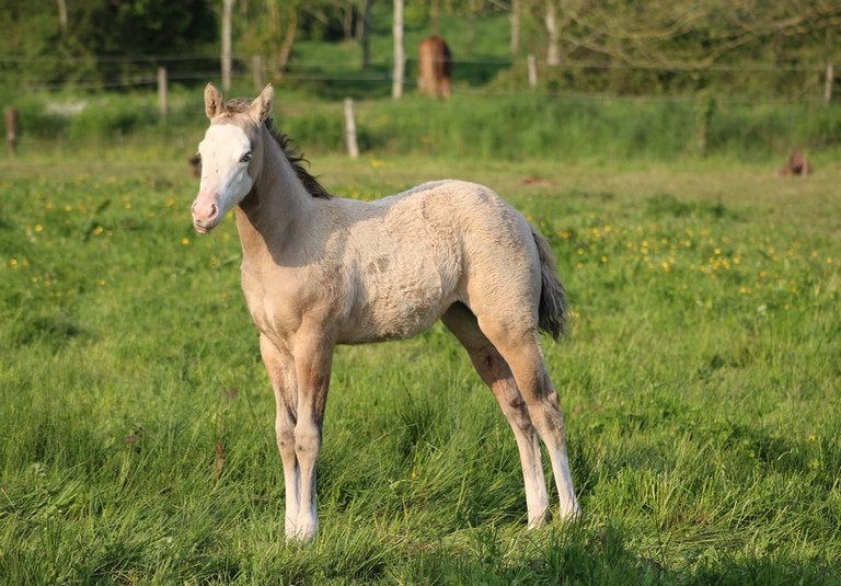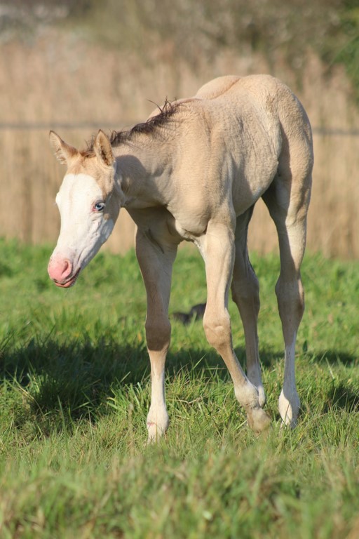 MEIKA GUN PRIMROSE est une très belle pouliche dunskin frame et splash overo aux yeux bleus avec de très belles lignées, sa maman est une fille directe d'Heavy Duty Gun gagnant du NRHA Las Vegas, lui même fils du légendaire Gunner. Son père est un QH fondation stationné en Allemagne.
