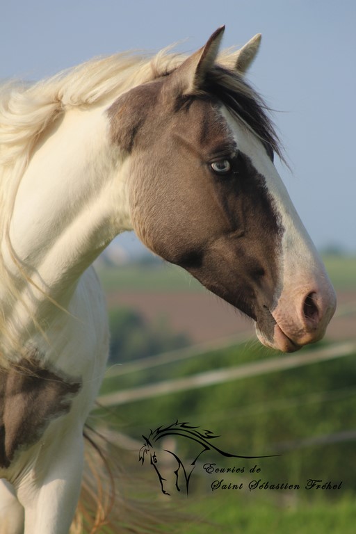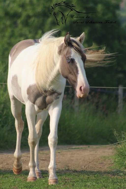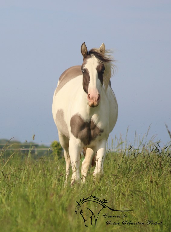 Très belle avec sa robe grullo tobiano et ses yeux bleus.
