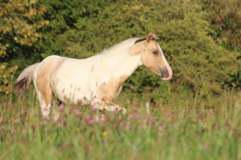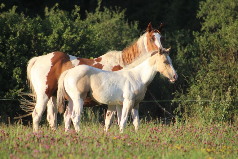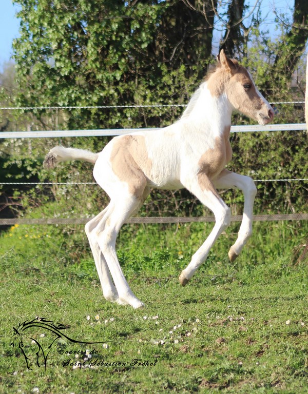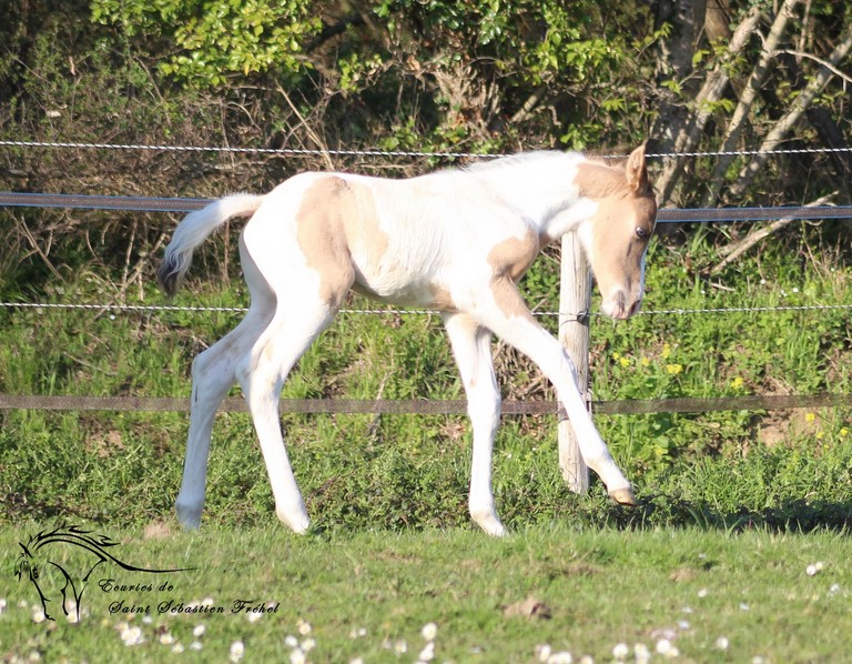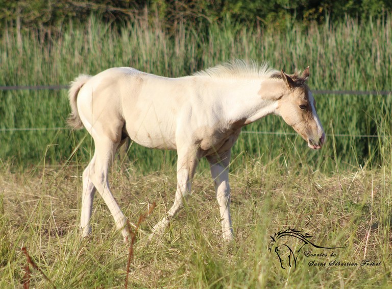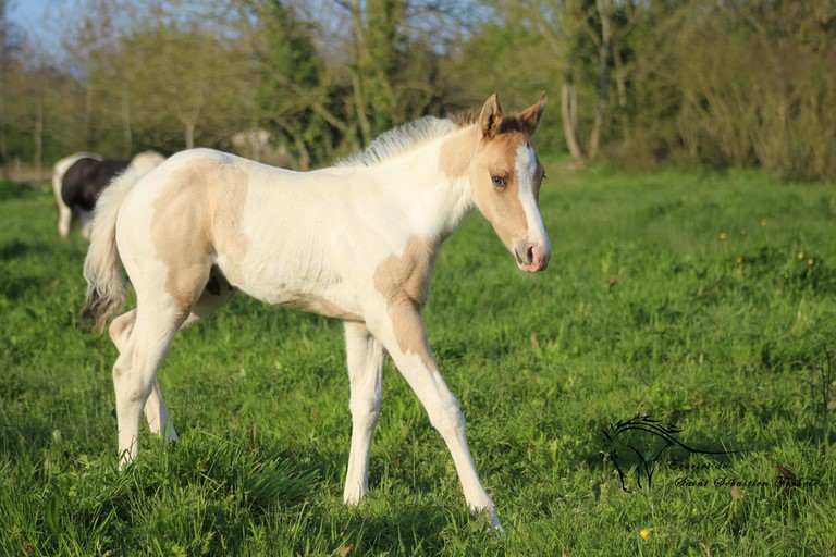 NODIN FLITZ PRIMROSE est un adorable poulain paint horse à la belle robe isabelle tobiano, avec une jolie bouille à bisous.