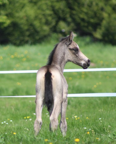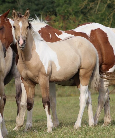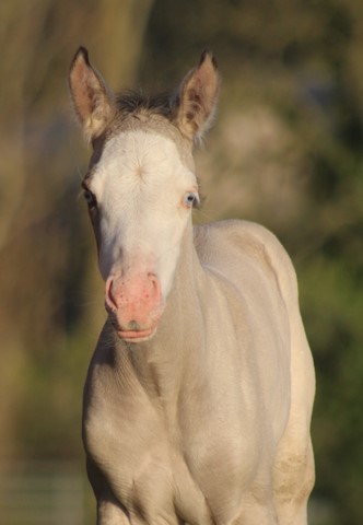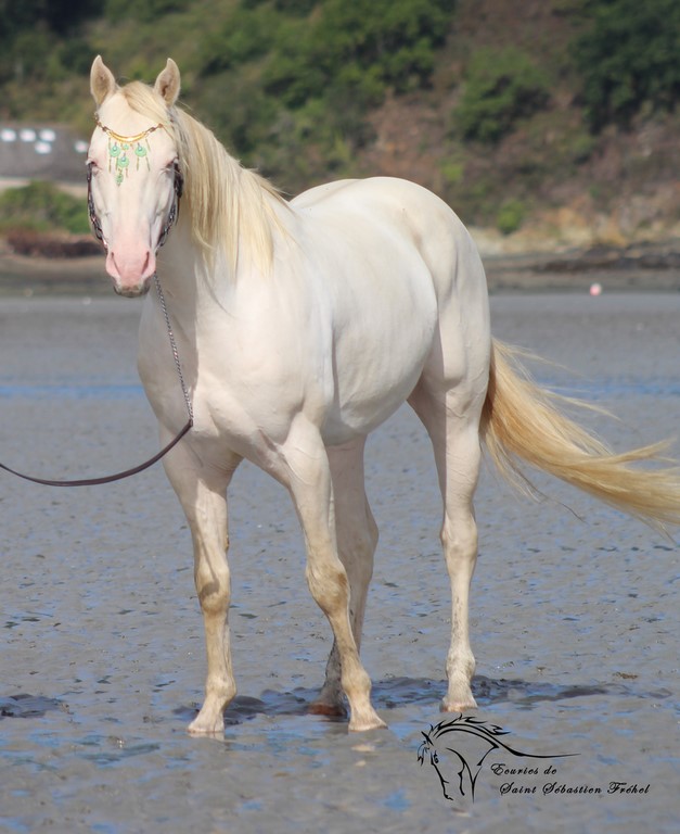 Snow est doté d'une génétique très intéressante: 2 gènes crèmes sur une base baie (il est donc perlino) et en plus un gène dun (ce qui fait de lui un perlino dun!). Homozygote noir, il donnera 100% de poulains buckskins, dunskins (isabelles), smocky grullos (souris) ou smocky black avec une jument alezane! Négatif LWO il peut être croisé avec des juments ovéro de tout type sans risque.