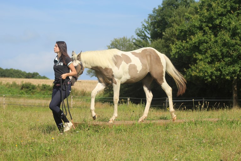 Très attachant il s'applique beaucoup à faire les franchissements qu'on lui propose, il comprend vite et est intelligent! Un poulain avec qui lier une belle complicité! Très bien manipulé, il donne les pieds, se laisse toucher partout, est facile à licoler, suit très bien en main, franchit des passerelles, va dans l'eau, monte et voyage bien en van...