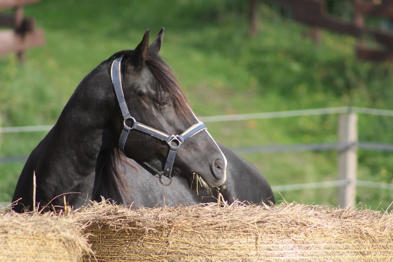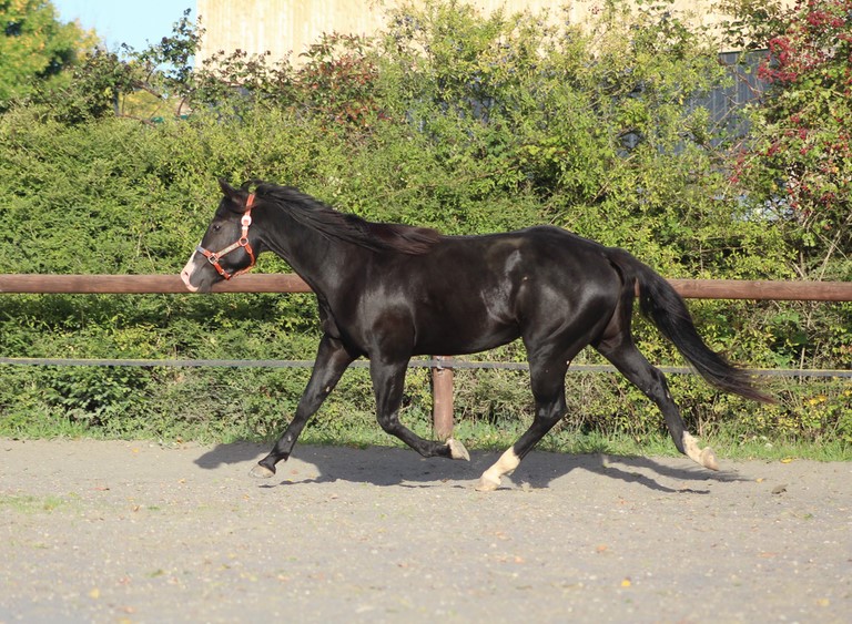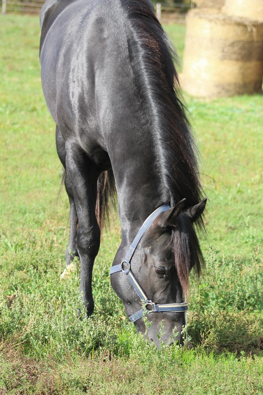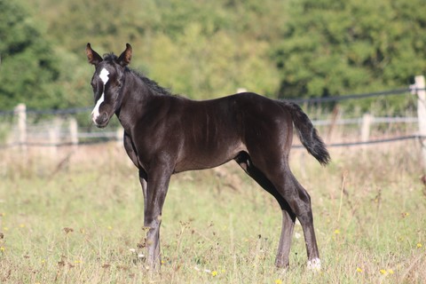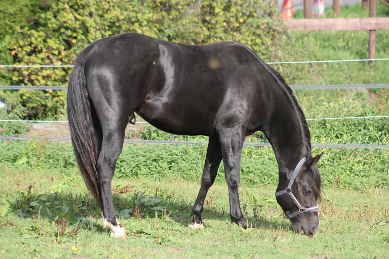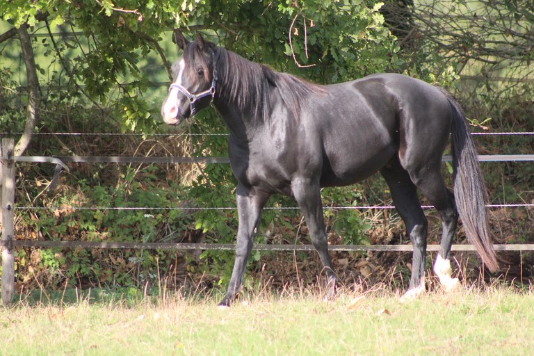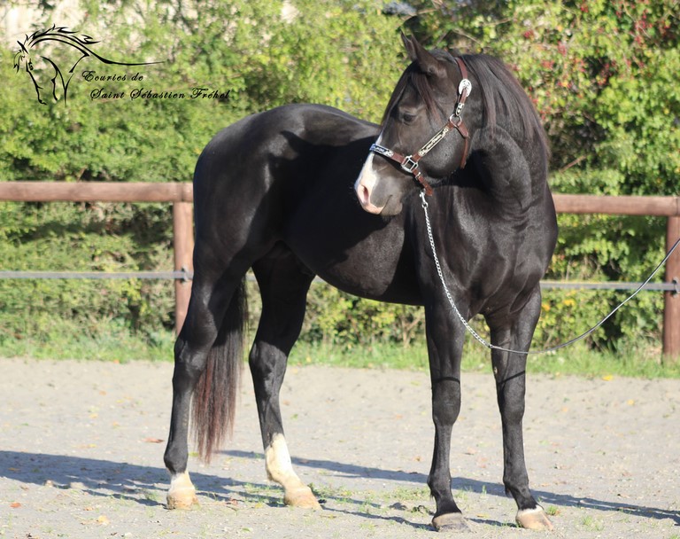 Je suis tombée sous le charme de Sioux après l'avoir vu en photo. Je cherchais depuis un moment un entier ou étalon black splash mais sans trouver le modèle qui me convenait. Là Sioux possèdait tous les critères que je recherchais: un modèle compact sans être lourd avec un dos bien tendu, une encolure bien greffée et orientée, une belle épaule, une jolie tête expressive et des yeux très doux. En plus de ces qualités constitutionnelles Sioux est très gentil, facile à vivre, sociable, sans aucune mauvaise manie d'entier. Issus de parents importés du Canada il a des origines qui sont peu communes en France. Alors même s'il n'est pas beaucoup marqué splash, Sioux a de nombreuses autres qualités qui compensent! Négatif au panel 6 (incluant le LWO) Sioux peut être croisé avec toutes les juments, même les overos! De plus il est homozygote noir.