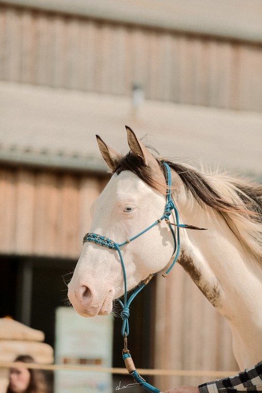 WHITE BARLINK ARIZONA est un jeune étalon né en 2022, importé de Belgique à son sevrage, de robe grullo overo homozygote splash et homozygote Dominant White 20 aux yeux bleus, de lignée all around et halter.