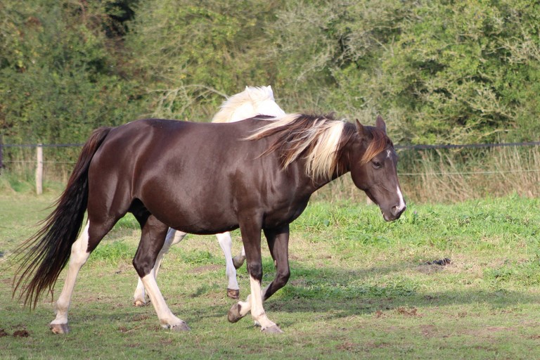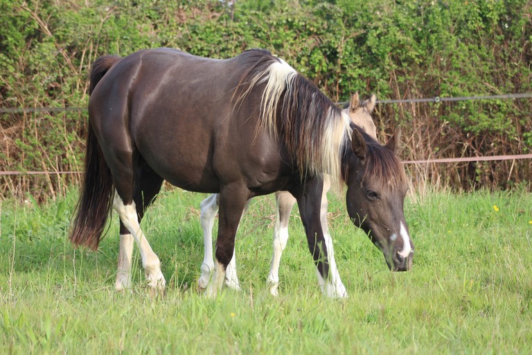 Winona est une paint horse smocky black (chocolat) tobiano. Comme sa robe Winona est très gourmande!