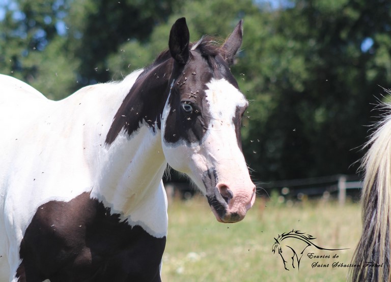 Brasilia est une grande et belle poulinière paint horse PP USA et France, de robe black tovéro, aux deux yeux bleus. Elle a déjà pouliné 4 fois, elle fait de grands poulains avec de l'os, de la taille et du cadre. Non débourrée, elle est à vendre uniquement pour poulinière suite à un accident dans sa jeunesse. Elle est pleine de notre étalon Snow, quarter horse fondation perlino dun homozygote noir aux origines ranch reining/cutting pour un beau et grand poulain avec de l'os pour 2024. Le poulain sera de robe smocky grullo, smocky black, buckskin ou dunskin et de pattern tobiano, tovero, overo ou solid et peut être lui aussi avec les yeux bleus! Quelle que soit sa robe ce sera un beau poulain porteur! Bien entendu elle est négative panel 5, ainsi que l'étalon qui l'a saillie.