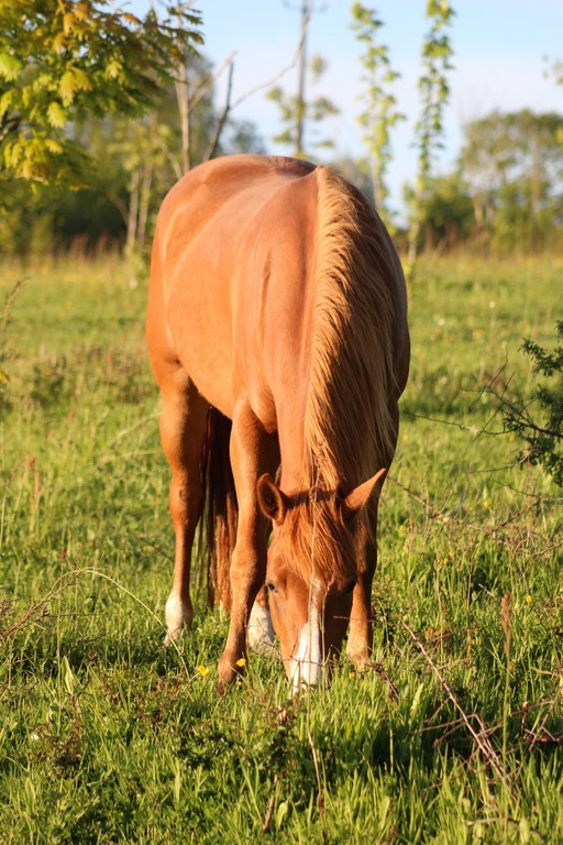 Ekiona est une jolie paint horse alezane solid, un modèle court et très carré (type bulldog), d'origines fondation (son père Sylden King Fritz a été reserve champion NFQHA et a reçu aux USA un entraînement de reining de haut niveau).