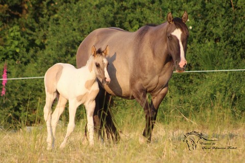 - Nos juments, sur qui le poulain va calquer son comportement, sont choisies d'abord pour leurs qualités sous la selle (toutes nos juments ont été ou sont montées, certaines se sont classées en concours et la plupart sont labellisées Loisir), constitutionnelles (dos fort et porteur, bons aplombs...) et avant tout sur leur mental (toutes sont d 'excellentes juments de selle et sont agréables à manipuler, elles sont sûres, confortables, elles n'ont peur de rien ou presque et sont aux ordres, la plupart ont travaillées en centre de tourisme équestre et sont des juments pour tous niveaux, aussi bien pour les enfants débutants que les adultes confirmés), elles sont toutes pleins papiers France + USA. Elles sont rustiques et vivent en extérieur toute l'année. Nous excluons de la reproduction des sujets atteints de maladies transmissibles ou génétiques. Nous utilisons uniquement des juments Paint Horse et Quarter Horse Fondation pour vous garantir un type et un modèle de qualité.