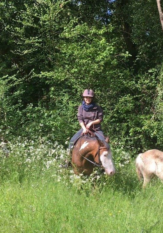 Débourrée au printemps 2019 elle se montre très froide sous la selle et facile. Placide en promenades elle ne s'émeut pas de grand-chose. De plus Framboise est porteuse!