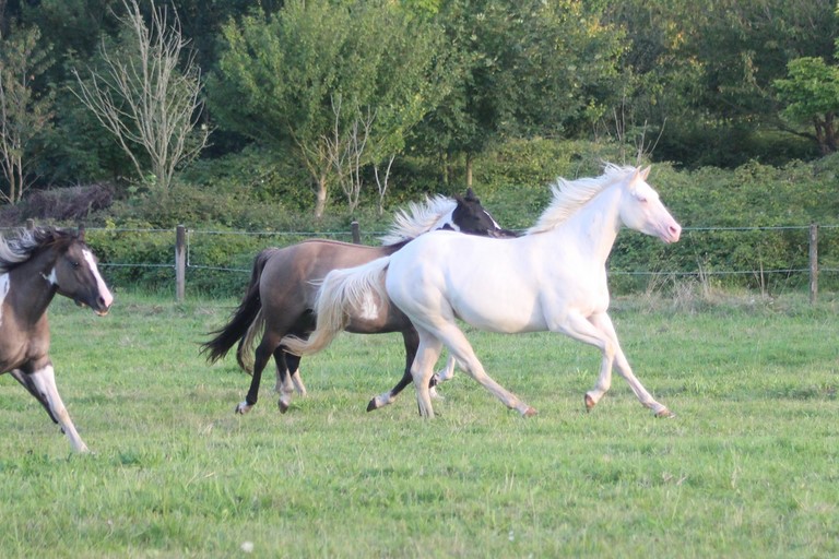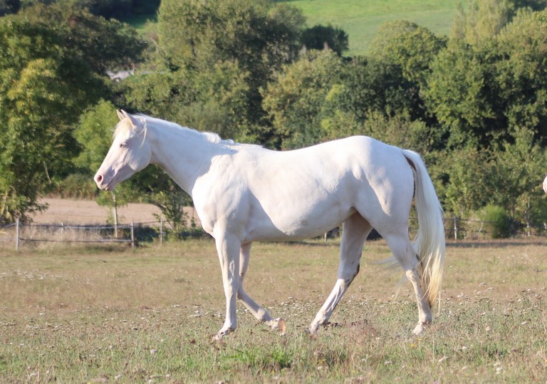 Injoy est une belle pouliche quarter horse fondation à la robe rare: crème splash (encore plus rare chez les quarter horses!). De belles origines fondation reining/cutting pour cette grande pouliche au regard iceberg. Son père a été labellisé ELITE LOISIR et est un cheval très sympa à monter. Injoy a une belle morphologie musculeuse et de la taille, elle devrait toiser adulte quasiment 1m60. Injoy va donner du modèle et de la couleur à ses futurs poulains!