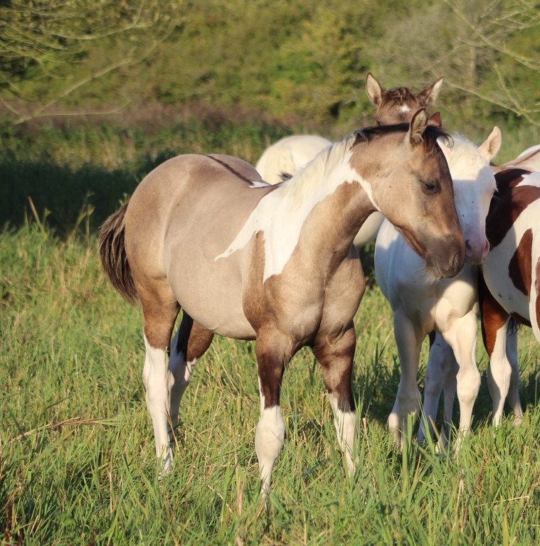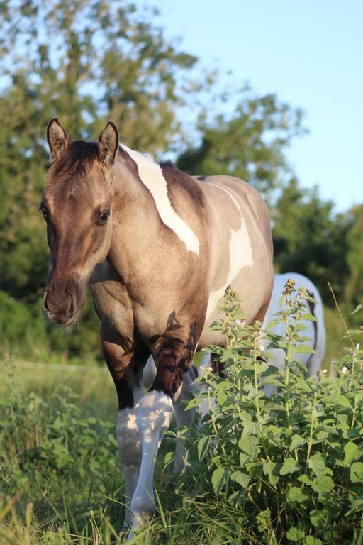 JESSE JAMES PRIMROSE est un beau et solide poulain paint horse grullo tobiano avec un très beau marquage dun, une jolie tête. Un poulain très craquant!