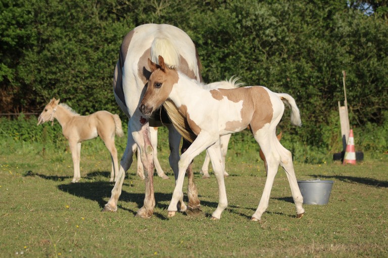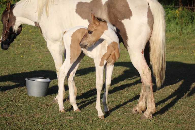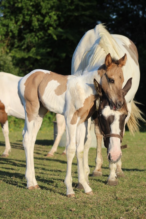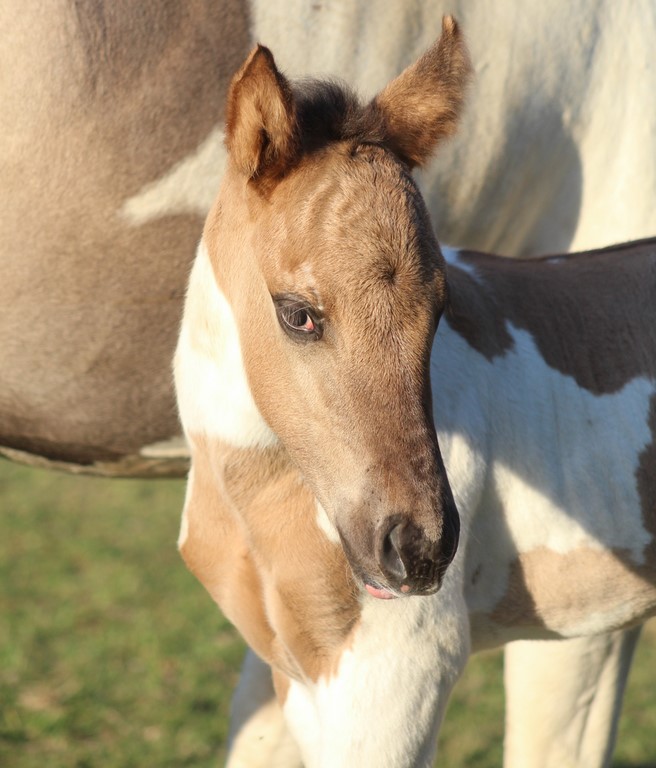 Knight Silver Primrose est un beau poulain avec de la taille et du cadre, de robe grullo tobiano, possiblement homozygote tobiano, noir et dun.