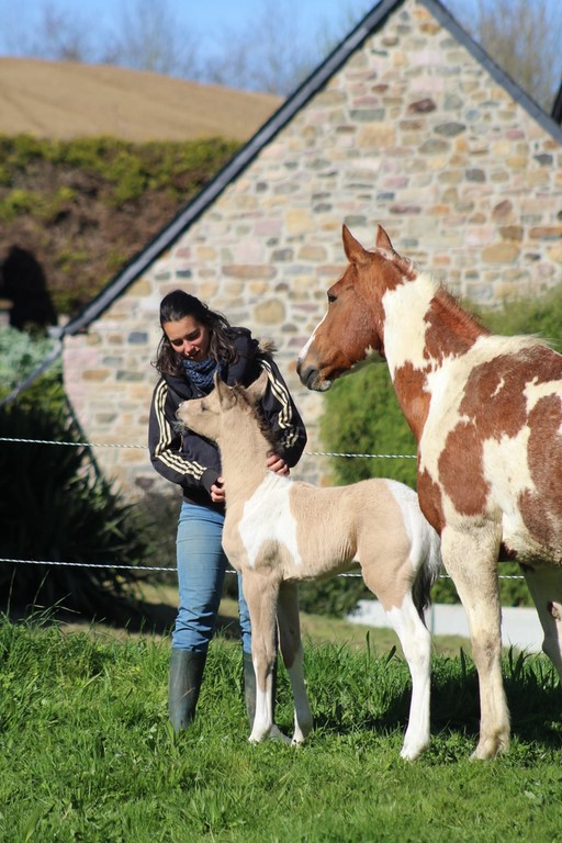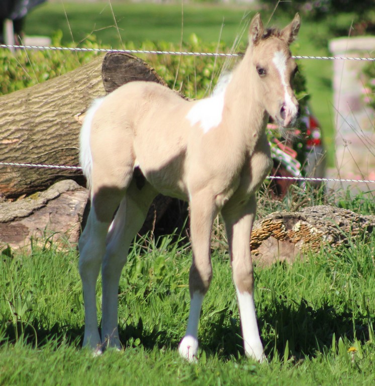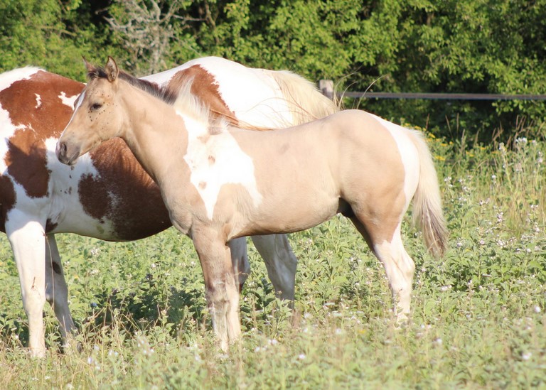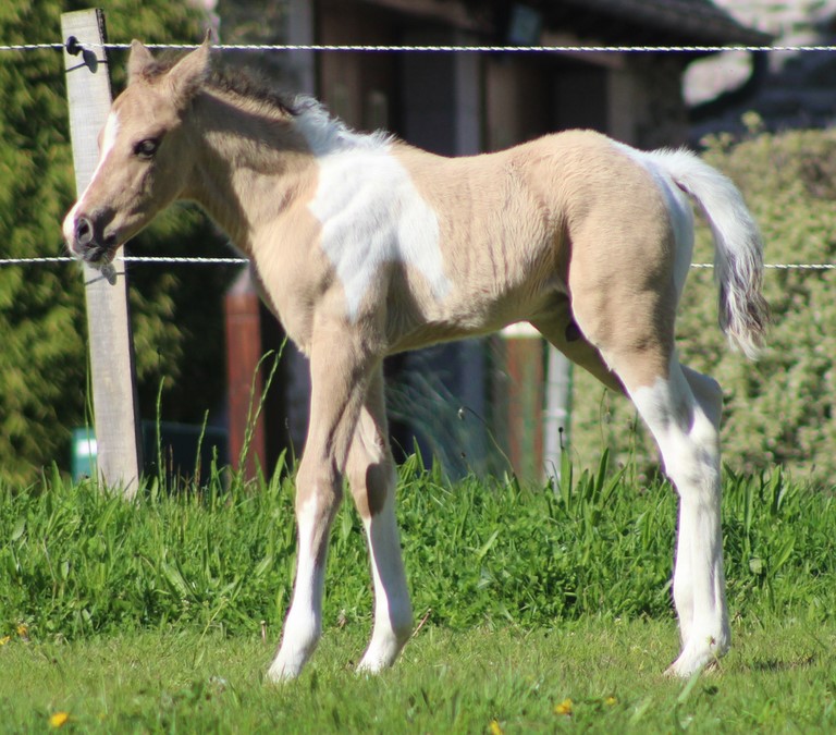 MANI FLITZ PRIMROSe est un adorable poulain paint horse à la belle robe dunskin (isabelle avec un gène crème et un gène dun) tobiano, une véritable bouille à bisous qui vient réclamer des gratouilles et apprécie énormément de se faire câliner.