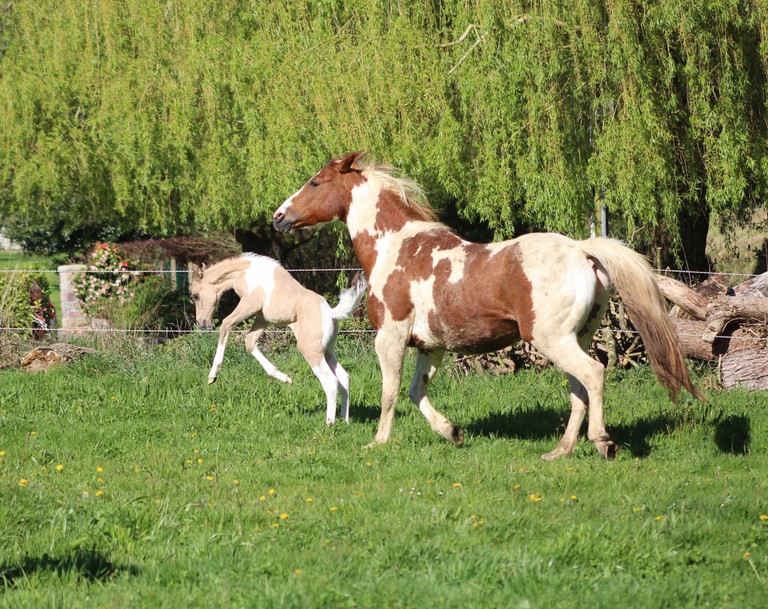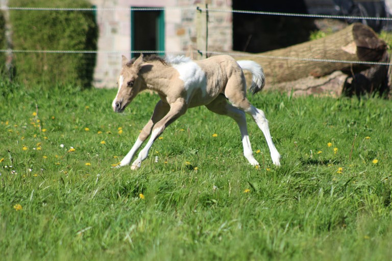 Plein d'énergie il aime jouer averc les autres poulains, faire des courses et plein de cabrioles.