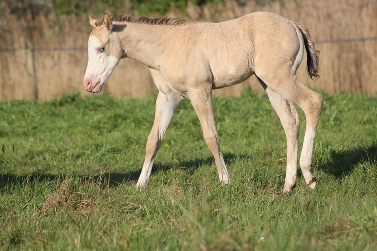 MEIKA GUN PRIMROSE est une très belle pouliche dunskin frame et splash overo aux yeux bleus avec de très belles lignées, sa maman est une fille directe d'Heavy Duty Gun gagnant du NRHA Las Vegas, lui même fils du légendaire Gunner. Son père est un QH fondation stationné en Allemagne.