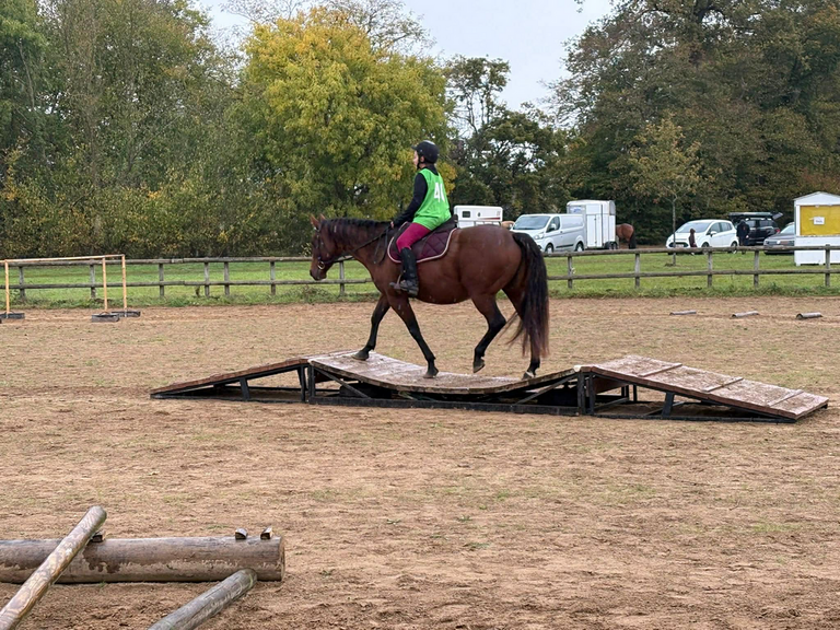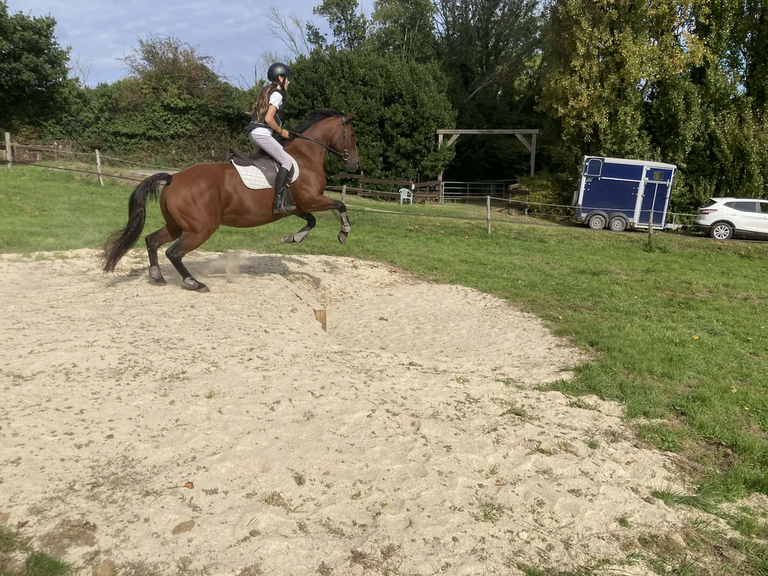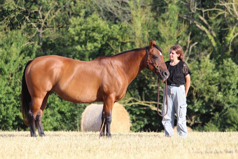 Elle convient parfaitement à un enfant débutant les parcours, à un ado, ou à un adulte souhaitant monter en toute sérénité. NJ toise 1m50, est très porteuse et peut être montée par toute la famille. Elle vit en troupeau au pré, est facile à attraper, respectueuse aux soins, et voyage sans souci en van comme en camion. Elle est ferrée aux antérieurs, à jour de vaccins. Panel 7 négatif, sauf n/GBED (porteuse saine, sans aucun impact sur sa santé ni sur une utilisation loisir ou sportive).