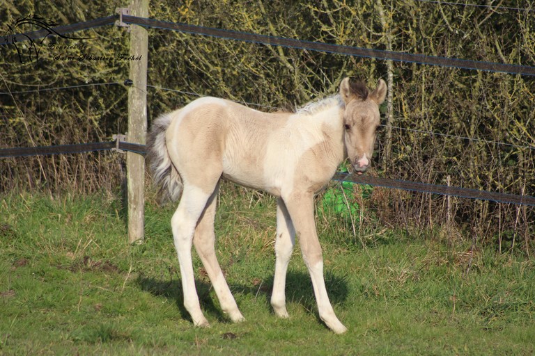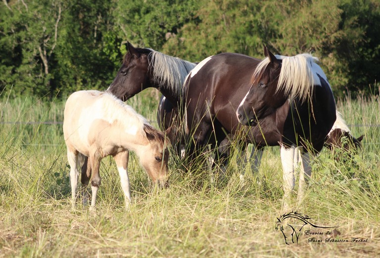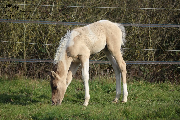 NUTS est une magnifique et adorable pouliche paint horse PP USA et France, née le 9 février 2023, de robe isabelle tobiano homozygote noire (test dun en cours) donc bucskin ou dusnkin. Sa maman est une paint horse black tobiano double homozygote de 1m50 au caractère exceptionnel, très froide, peu réactive, elle travaille dans un centre de tourisme équestre où elle promène les enfants de colonie de vacances depuis ses 3 ans et fait du Mountain Trail en compétition. Son père est notre étalon quarter horse 99% fondation perlino dun avec une solide morphologie, de l'os et un dos bien tendu, il toise 1m53. Peu farouche Nuts aime se faire caresser, elle s'éloigne de sa maman et aime aller explorer les environs. Elle sera idéale comme cheval de famille, de loisirs, pourra aussi être votre prochaine poulinière (j'ai gardé sa sœur utérine comme relève à l'élevage) ou pourquoi pas pour vous essayer à la compétition?. Nuts est bien entendu négative panel 5 par filiation, elle sera prête pour aller dans sa nouvelle maison dès août 2023, pucée, parée, vermifugée, primo-vaccinée et avec ses papiers en ordre. Elle sera bien manipulée (mise du licol, se laisser toucher tout le corps, prise des pieds, attache, monter en van, passer une petite difficulté type passerelle, bâche...).A reserver 6000€