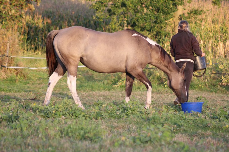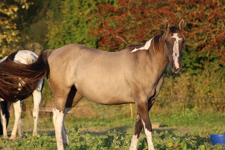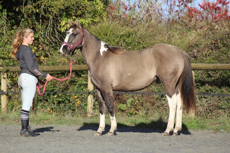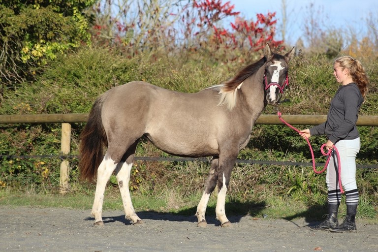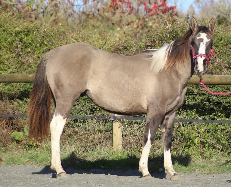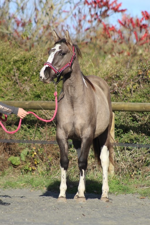 Pepper est une belle pouliche grullo tobiano, bien manipulée gentille et proche de l'homme. Sera assez grande (autour d'1m55) et porteuse. Très belle robe silver grullo. Idéale pour loisirs ou élevage, bonnes origines parents importés du Canada et des USA!