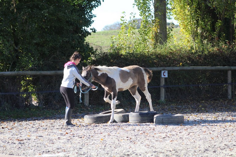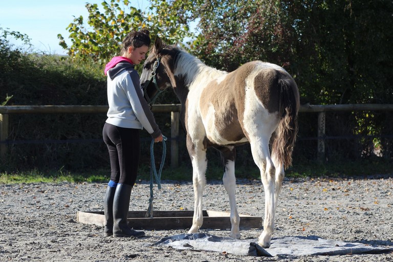 Bien manipulé Isha se laisse licoler, connaît l'attache, monte et voyage sagement en van, suit en main et passe des petites difficultés styme bâche passerelle...