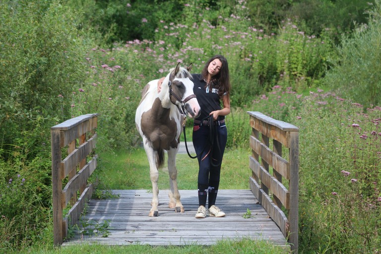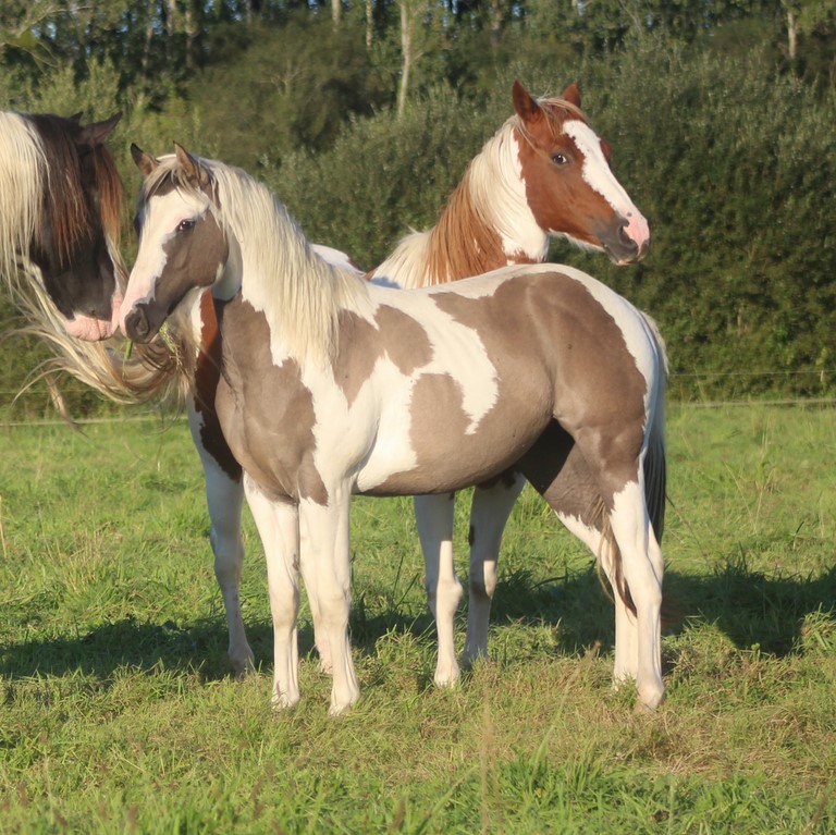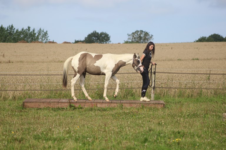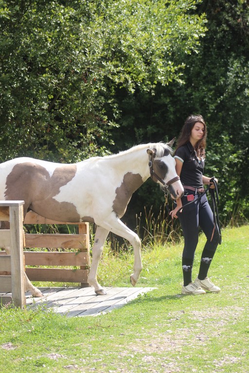 Très attachant il s'applique beaucoup à faire les franchissements qu'on lui propose, il comprend vite et est intelligent! Un poulain avec qui lier une belle complicité! Très bien manipulé, il donne les pieds, se laisse toucher partout, est facile à licoler, suit très bien en main, franchit des passerelles, va dans l'eau, monte et voyage bien en van...