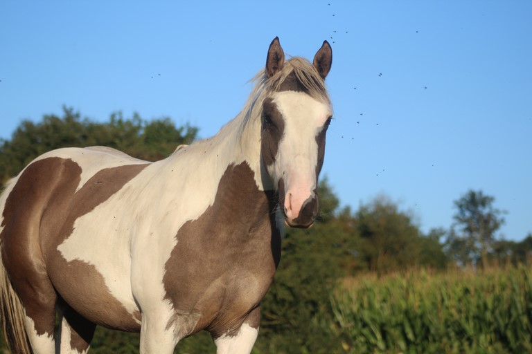 Sa belle robe grullo tovéro est originale. Il est hétéozygote tobiano, porteur du DW20 et frame, utilisé comme étalon il produira plus de 75% de poulains colorés dont des ovéros DW20 qui sont réputés pour être bien colorés!
